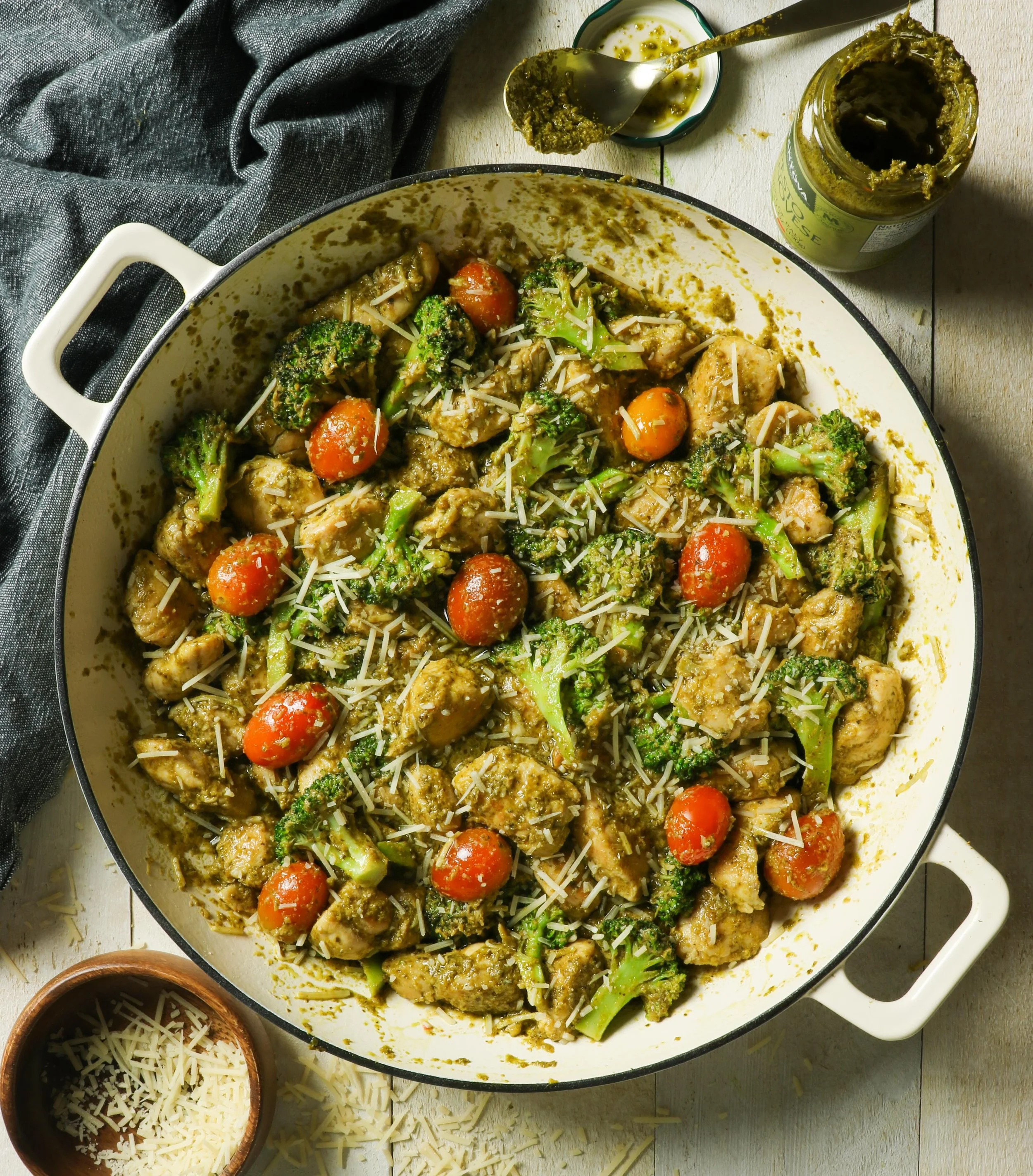 Turn the heat off and stir in the chicken and the pesto, until everything is evenly coated. Top with the shredded parmesan, and serve family-style, right out of the pan.